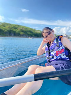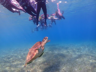 海明珠民宿環境乾淨房間舒適,早餐提供的菜色非常棒,對吃常備菜的我們很速配,老人家早起床,又是第一組客人,滿滿一大盤菜與熱熱一碗純漿,開啟快樂的一天。參加蟹老闆花瓶石浮潛,正值漲潮可看到更多隻綠蠵龜,三隻在一起吃藻類的畫面好棒,與綠蠵龜同游真幸福,有昨天的浮潛經驗,這次沒有頭暈也沒有吃到海水,上岸後還是一條活龍,昨天浮潛上岸後,頭暈連眼睛都睜不開。回飯店沖洗更乾淨與塗抹防曬乳,兩佬開始機車環島,花瓶石、靈山寺步道、美人洞步道、海景休閒度假區,拍攝美景留下回憶。中午享受高人氣的社區麵店,cp超高。中午回飯店清洗休息。下午兩點半到寶哥名產旗艦店買麻花捲。三點參加蟹老闆灣仔港透明獨木舟,空拍與教練拍照留下好多美美回憶,初經驗出海域,波光粼粼在身邊,透明獨木舟觀賞海內生態,神仙魚、珊瑚發出多彩絢麗,看到年輕人的活力與樂趣,我們也要向他們學習。傍晚到杉福生態廊道享受福祿壽囍鯛魚燒與水果冰棒,杉福生態廊道的落日真是美。
