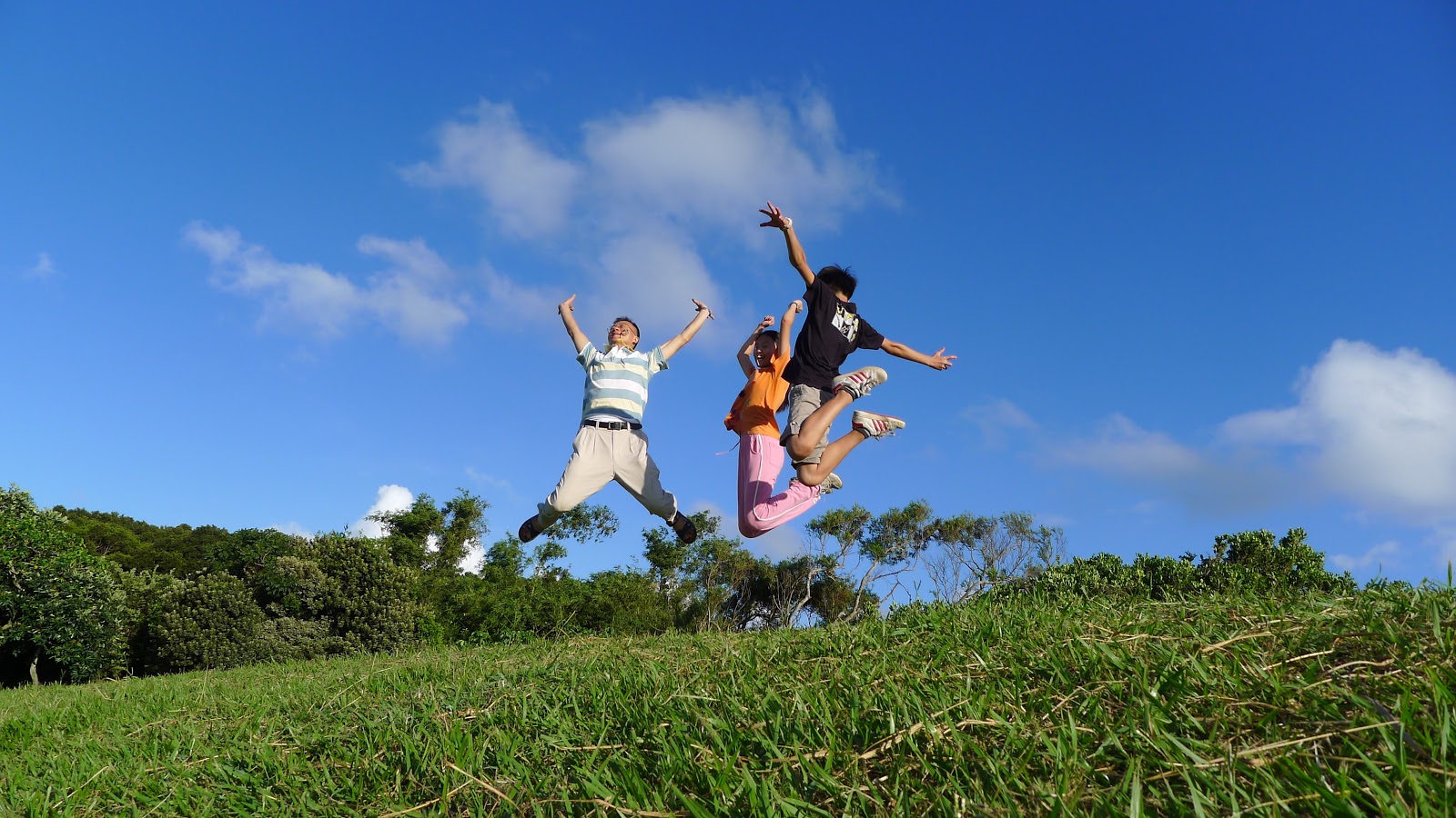 第一天:清晨我們在南港會合出發,謝謝以樂爸爸媽媽行程前祝福大家平安,大夥滿懷期待的心往國境之南,遊覽車的大哥與大姐詳和親切,心裡更安心不少,相信大哥大姊一定也對遊覽車呵護有加。往台中清水方向接第一次見面的富凱家,他們樂陶陶三明治與厚片吐司是我們家早餐與點心最愛的來源,我這次就預購了一千多元的麵包,瘋狂喔。一路暢快到屏東,看到台灣南部的大海、藍天、白雲,顏色與北部不盡相同,多層次、廣角度、不同飽和感,隨手一畫,令人感動的構圖就呈現在眼前。墾管處是我們第一站,老爺26年前曾在此擔任解說員,我們經由一位可愛的國中妹妹講解,她可以在十幾位大人面前不帕生認真解說墾丁國家公園的多樣性,我很佩服妹妹的勇氣,這裡從小就訓練膽量,對陌生人要抱持著歡迎的態度,與台北人的觀念有些許的差異,果然南部人真熱情。社頂自然公園芳草如茵的綠色大地、嶙峋粗銳的珊瑚礁地形,穿越鬼斧神工的一線天,遙望清澈藍天中鑲嵌的白雲朵朵,登高凌霄亭,俯瞰直直向大海延伸的青翠平原,老爺解說形狀酷似樹石盆栽的風剪樹緣由,落山風的巧手製造出風剪樹、九棚沙漠、風吹沙等特殊景觀。有大草坪當然就要有傳統,小朋友們一起往上跳,展現活力。等待夕陽西下,一起前往閩南式建築的墾丁青年活動中心,踏上自然海蝕的珊瑚礁濱海步道,在大尖山下,遙望美麗的夕陽往海平面下消失。在傳統的建築內,一起踩高蹺、打陀螺,童心未泯。傍晚時,幾朵棋盤腳盛開,這特殊的水漂果植物在恆春海邊常見,細長的雄蕊,在照相機下感光,彷彿在孩童時期流行光纖造型的藝術燈。夜晚在墾丁大街吃吃喝喝,夜宿明惠家。