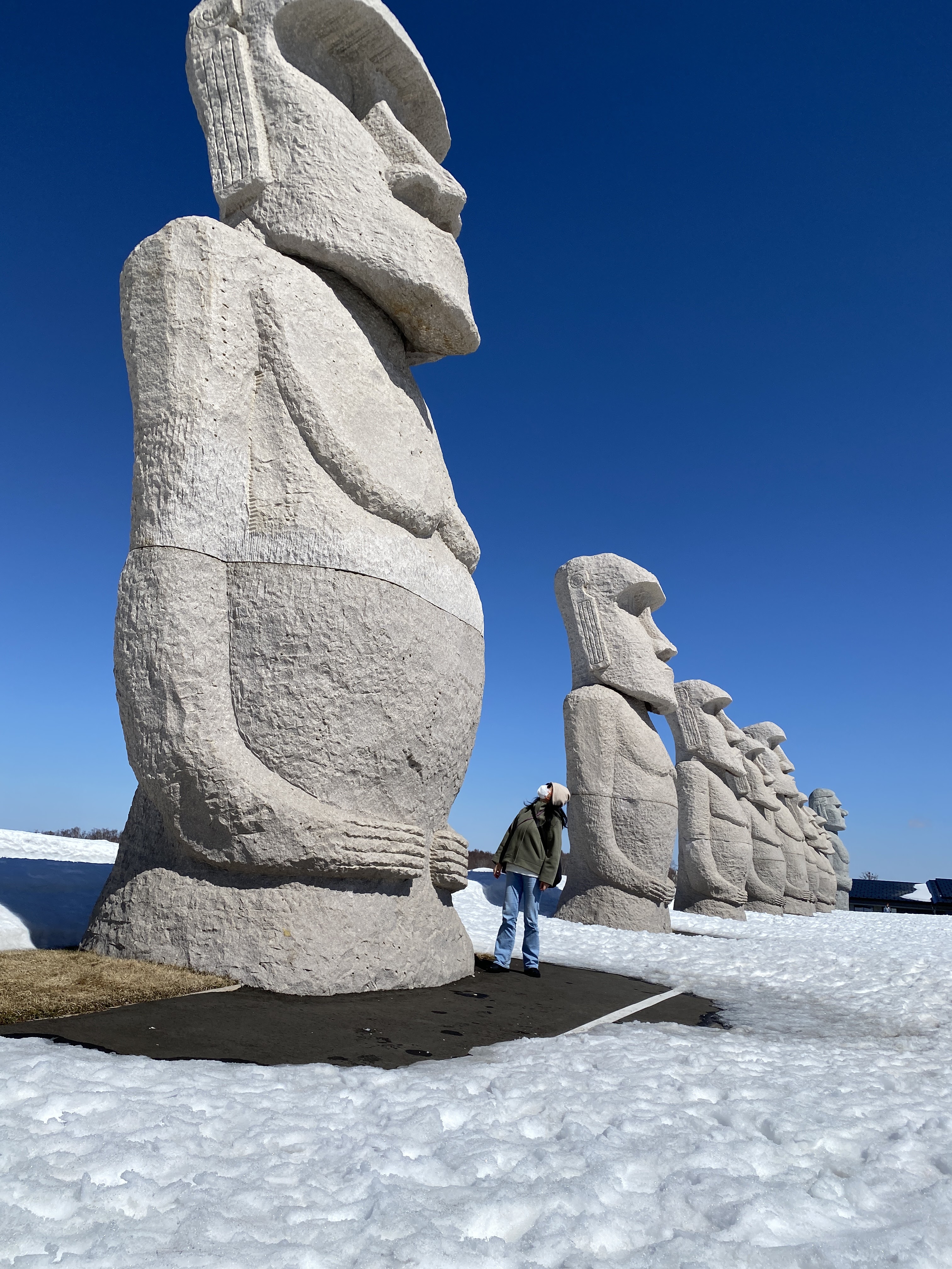 頭大佛位於札幌市真駒內滝野靈園的入口,安藤忠雄先生的作品。園內還有復活島的摩艾石像和巨石陣。一早出現藍色豔陽照耀銀白色世界,藍天、白雪絕美大景,讓我們為之瘋狂,手機相機狂拍不停。